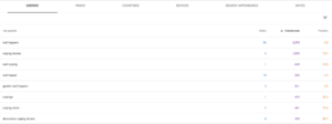 In this example, we can see several opportunities: ‘coping stones’ has 1,890 impressions at position 15.1 but only 3 clicks. Meanwhile, ‘garden wall toppers’ ranks at position 3.9 with 521 impressions but just 5 clicks – here the ranking is ok, but the meta title or description may need work to improve click-through rates.