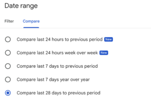 Using the date range filter, you can compare, for example, the last 28 days to the previous period.