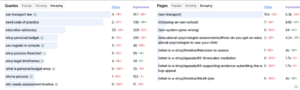 The quickest and easiest way to get started is by starting with your most popular pages by clicks within the “pages” tab, opening the URL(s) and then filtering the “top queries” of that page by impressions.